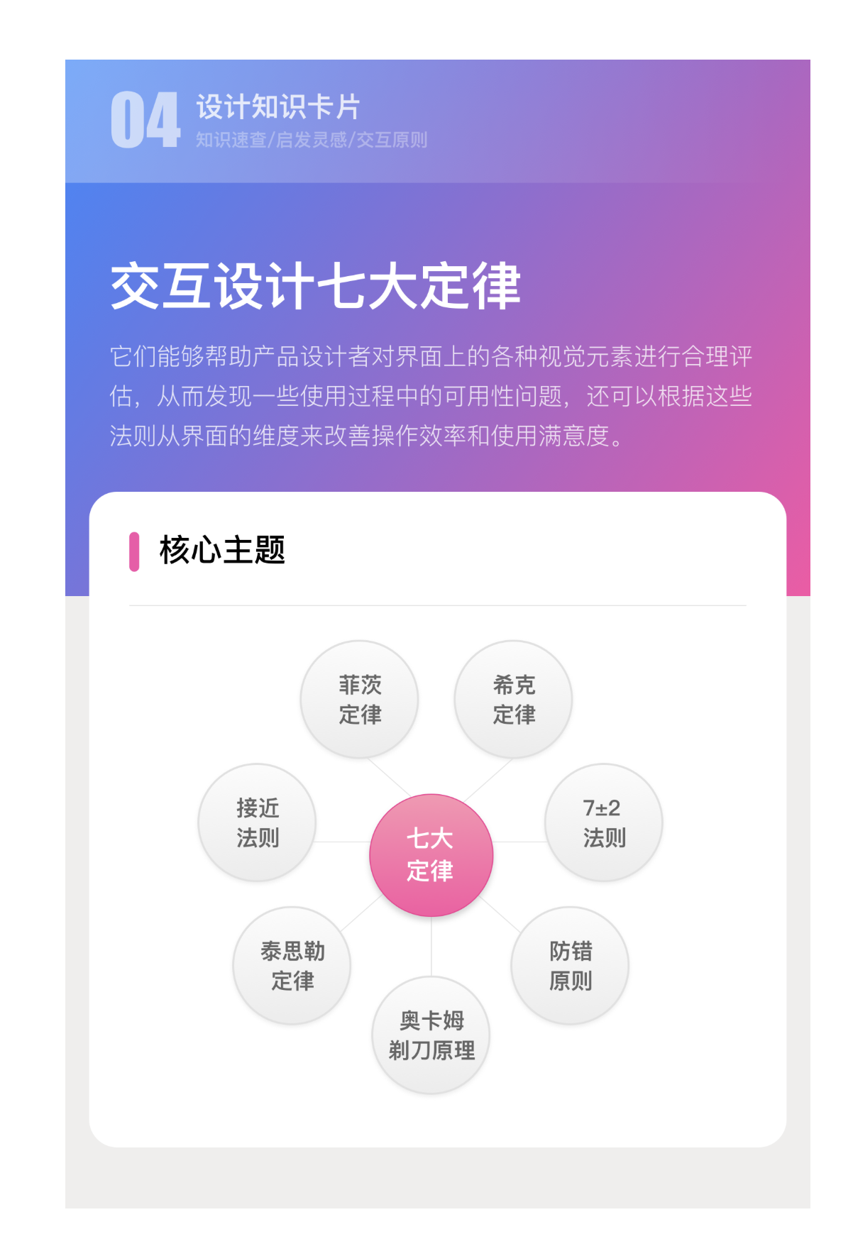 交互设计的本质,是搭建人与产品之间的顺畅桥梁。正如 “交互设计之父” 阿兰・库珀所言:“除非有更好的选择,否则就遵从标准”。那些经过时间验证的交互设计定律,正是这样的 “标准”—— 它们从人类认知规律、行为习惯出发,为产品设计者提供了可落地的指导原则,帮助规避可用性问题,提升操作效率与用户满意度。以下是对七大核心定律的深度解析与实践应用指南。
