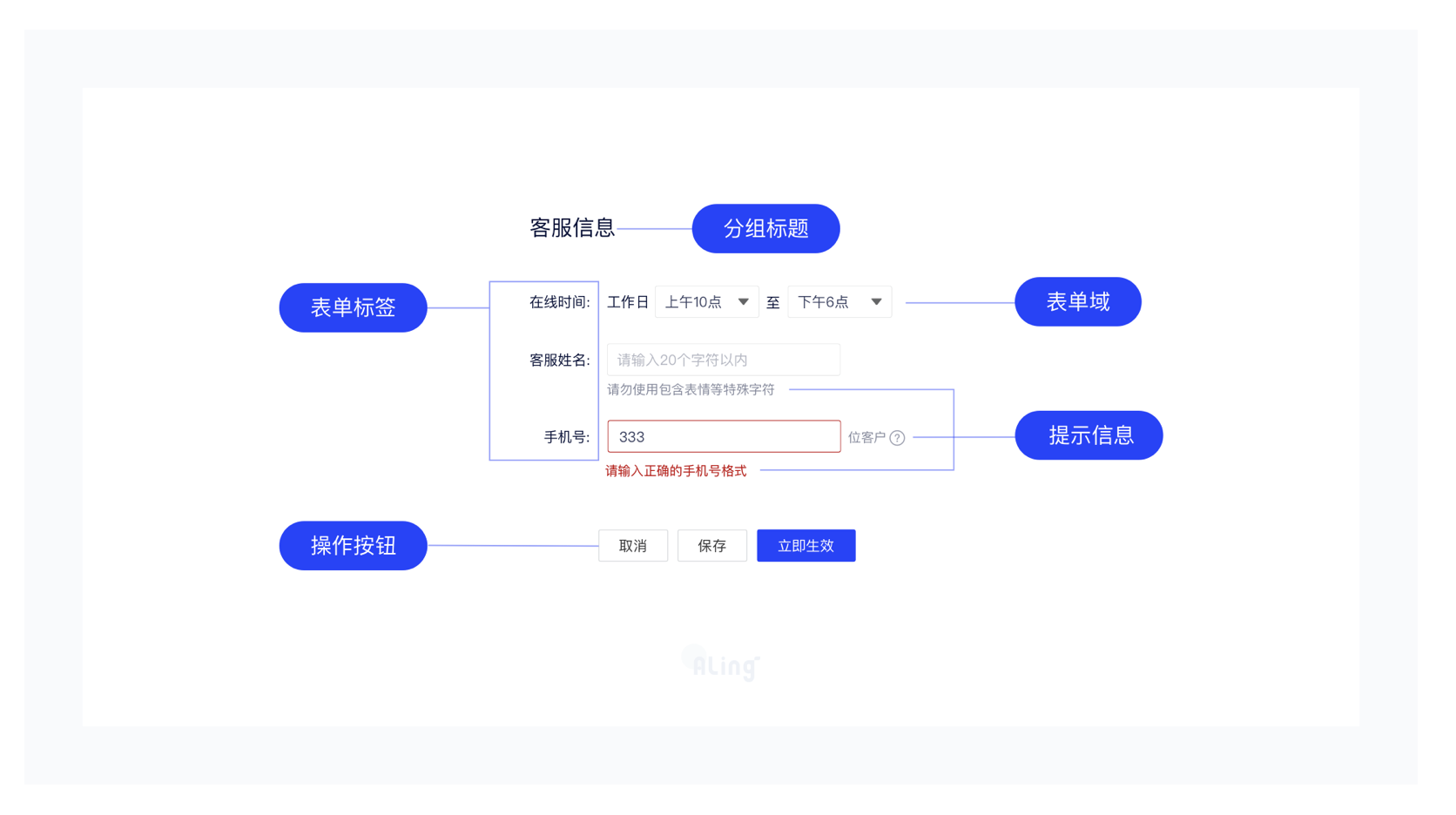 - 占位符:输入框内的临时提示,避免 “正确的废话”,如 “商品编号:6-10 位数字”;