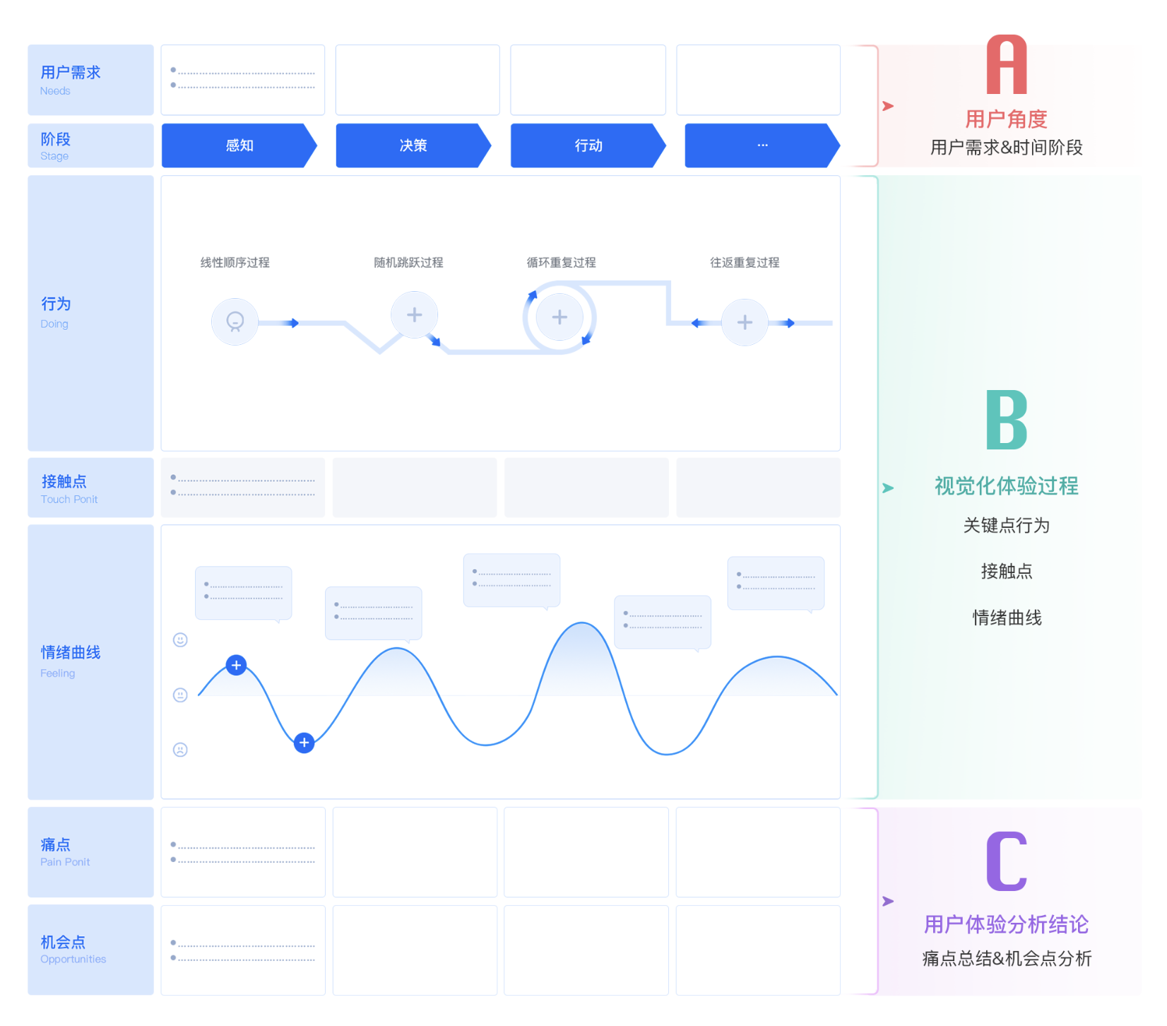 用户体验地图,是从真实用户视角出发,可视化呈现用户完成某一核心任务的全流程体验工具。它梳理了用户在任务中的每一个行为、与产品的接触点、伴随的情绪变化,精准定位体验痛点,最终提炼可落地的优化机会点。