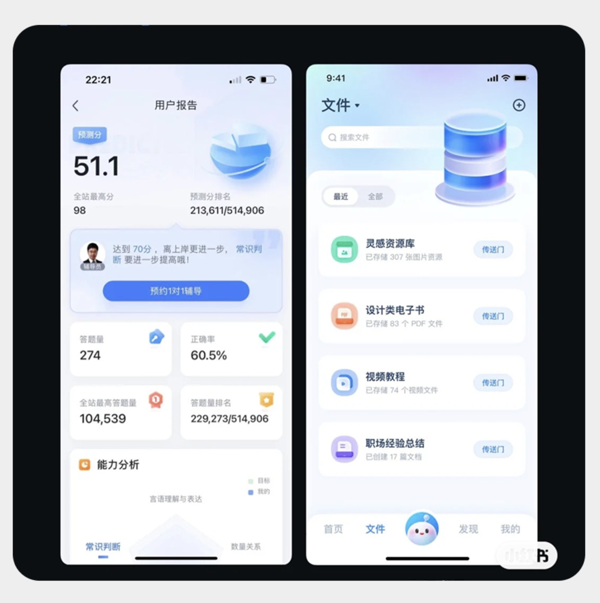 例如设计资源库的 “电子书合集”“视频教程” 卡片,学习平台的 “能力分析”“答题报告” 卡片,会标注文件数量、答题正确率、排名等信息,让用户快速获取核心分类线索。