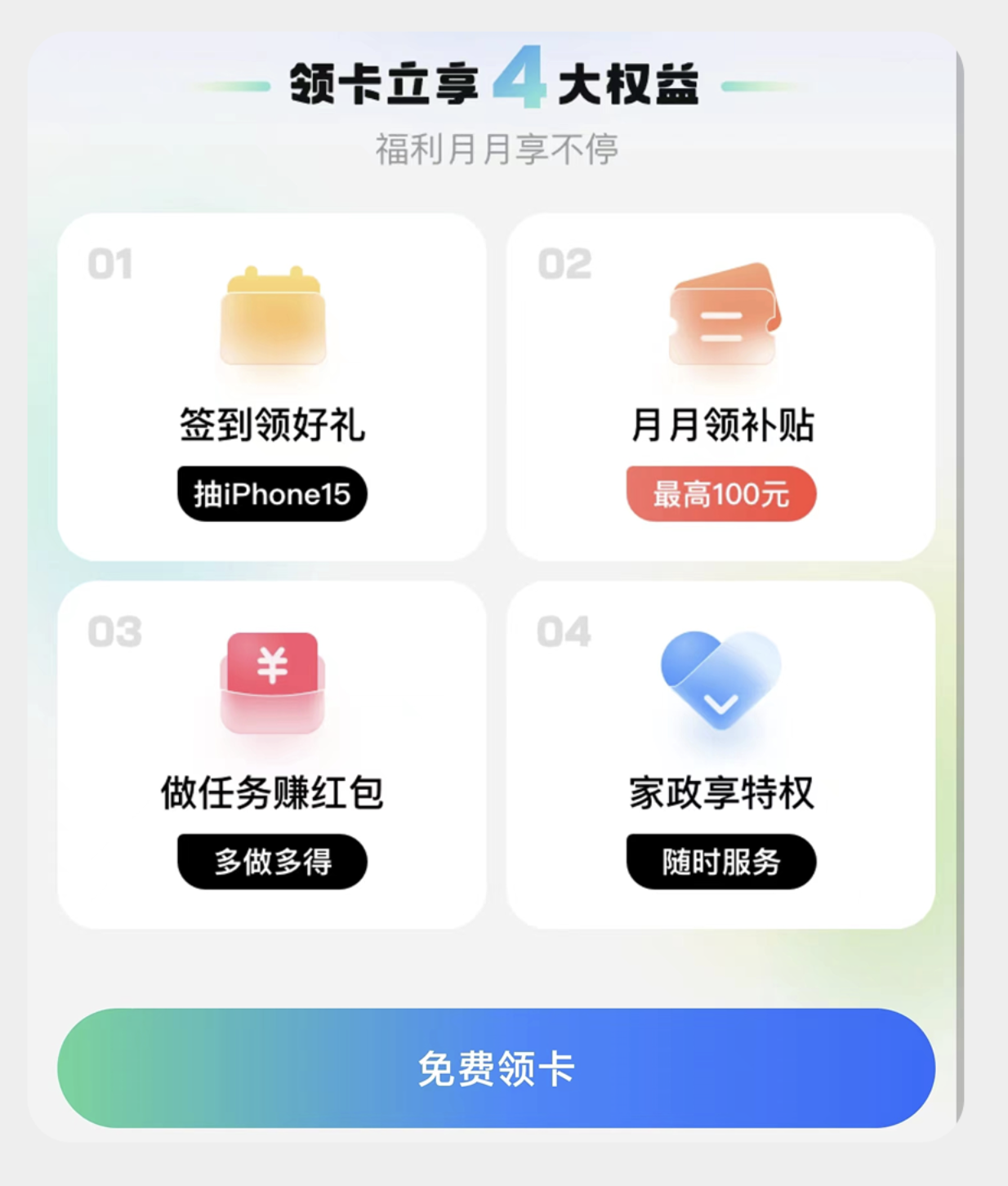 比如会员权益卡片、产品功能介绍卡、活动福利卡,常通过分点列举的方式展示 “签到领礼”“专属补贴”“会员特权” 等内容,搭配醒目的引导按钮,强化价值传递。
