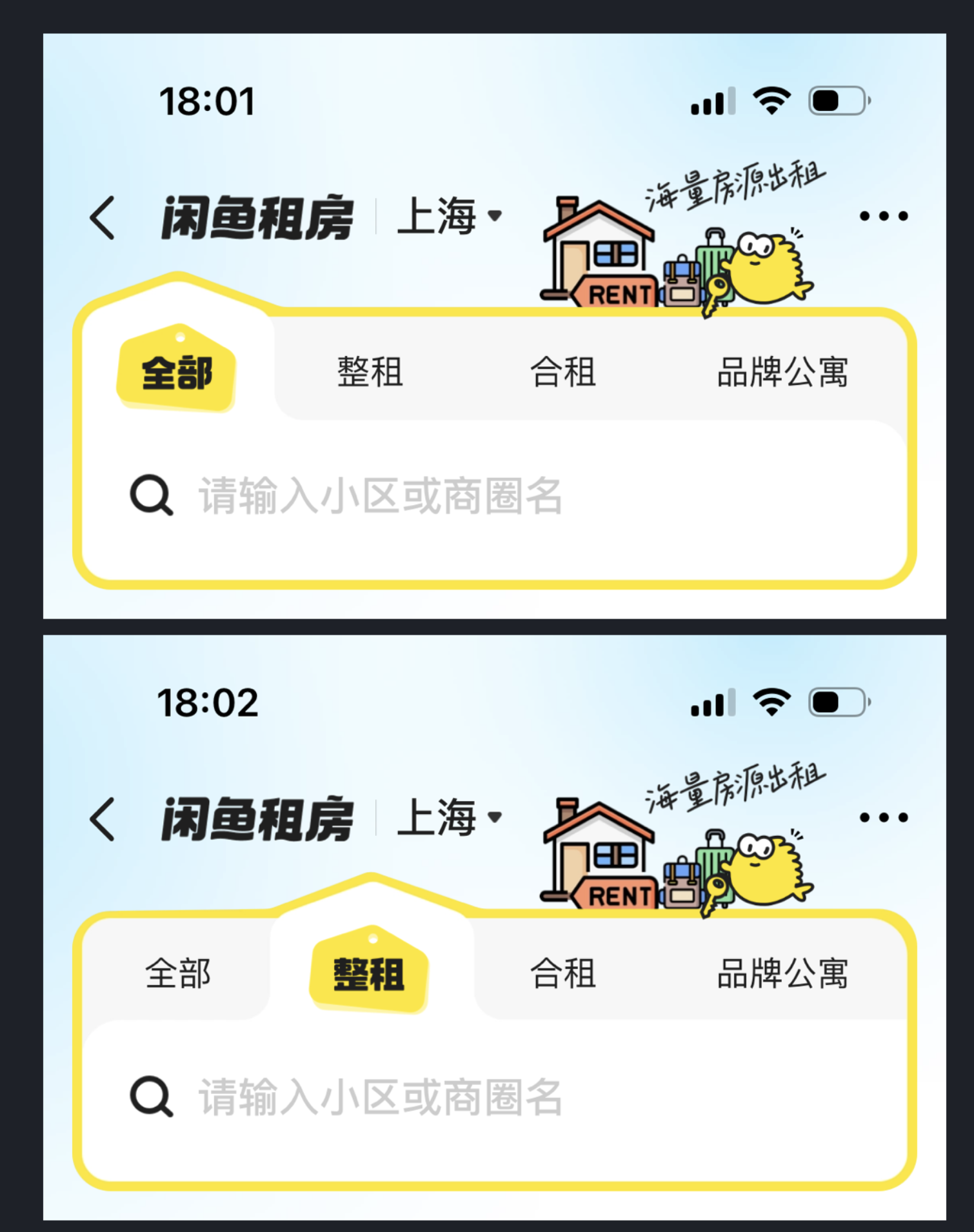 闲鱼租房栏目的卡片设计便是典型,它摒弃了常规的矩形卡片框架,将房屋结构的轮廓融入卡片造型,用极简的几何图形还原户型特征,既贴合租房的业务核心,又让卡片设计跳出了同质化的视觉桎梏。这种将业务特征与视觉设计结合的方式,不仅让卡片更有辨识度,还能让用户一眼感知到功能属性,实现了美观与实用的双重效果。