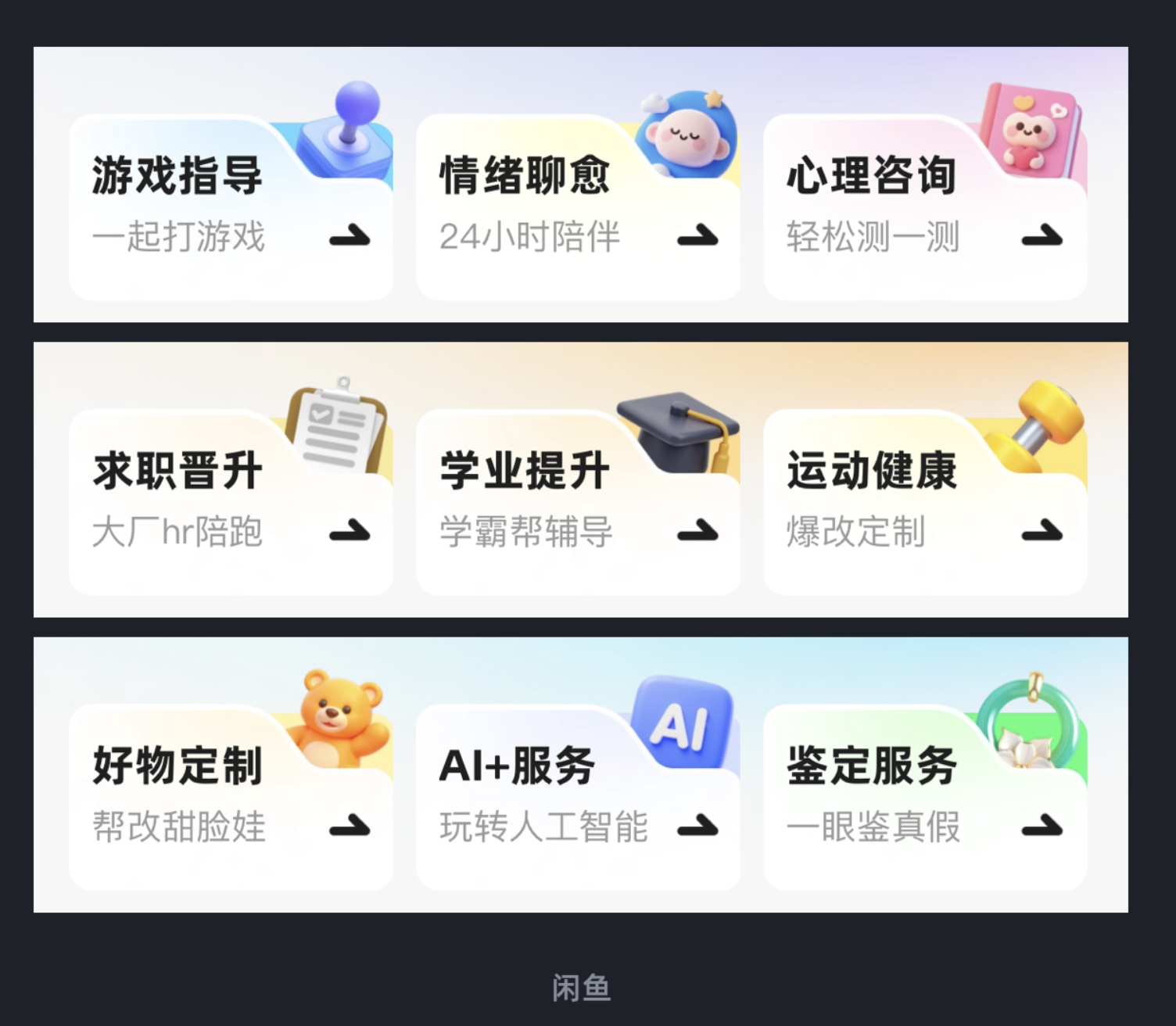 闲鱼副业栏目的设计将这一点发挥得淋漓尽致,首先让卡片一角做凹陷的异形处理,把功能图标精准嵌入凹陷区域,形成 “卡片 - 图标” 的贴合感;再通过背景卡片的色彩与层级衬托,让整组设计形成多层叠加的视觉效果。异形卡片打破了常规的规整感,图标与凹陷的结合让元素布局更巧妙,多层结构则进一步强化了模块区分,让整个界面既富有设计感,又能让用户快速识别不同功能模块。