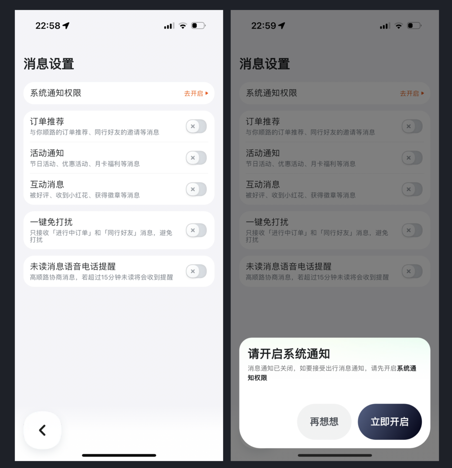 嘀嗒出行的消息设置设计就极具人性化,它没有刻意弱化关闭按钮,反而让操作更直观;同时为了避免消息过度干扰,特意设计了 “一键免打扰” 功能,让用户可自主选择仅接收核心消息。这种设计摒弃了 “单向引导” 的思维,而是赋予用户选择权,既实现了引导开启通知的核心目的,又兼顾了用户的使用体验,让交互设计更有温度。