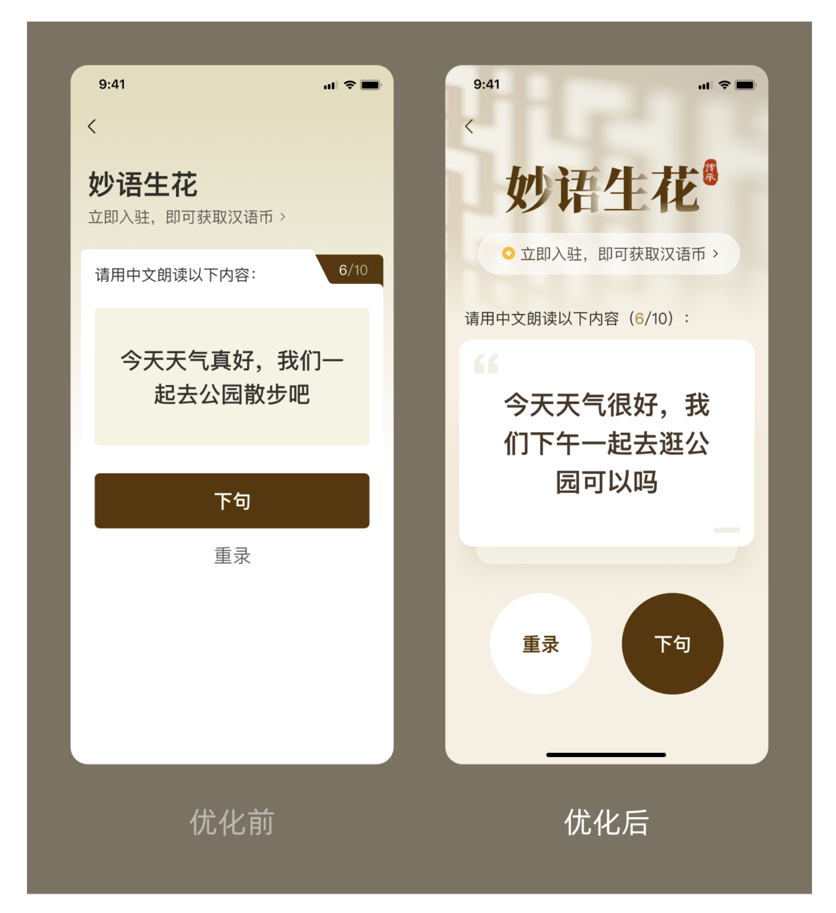 其实很多看似无从优化的常规界面,只是没找对发力点。那些让人眼前一亮的设计,往往不是靠复杂的元素堆砌,而是在细节处做巧思。下面就以一个语音跟读类界面为例,放上优化前后的完整对比,再一步步拆解实操技巧,看完你就知道,再普通的界面也能轻松提升质感!