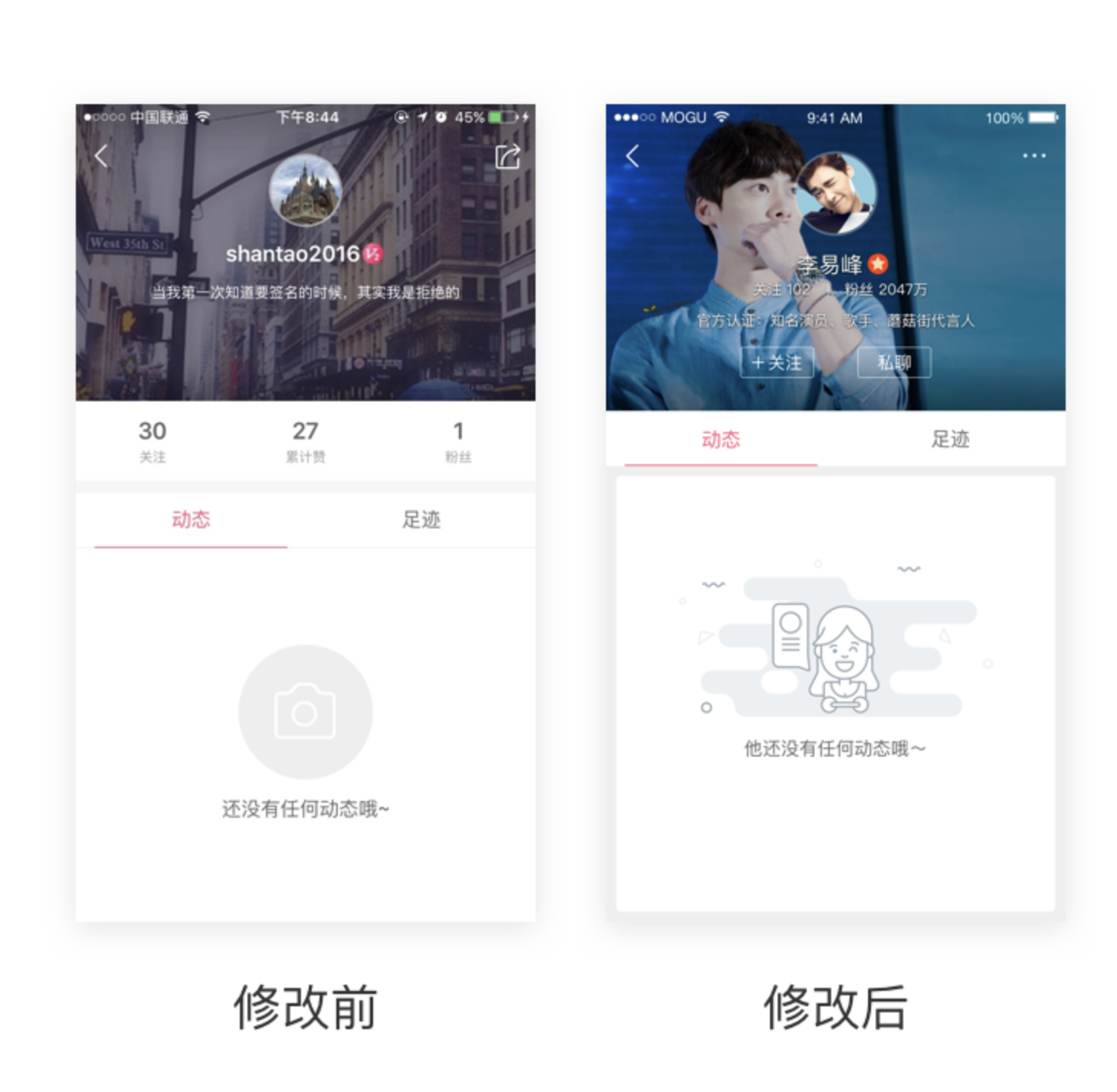 当下的空页面设计,正朝着趣味化、色彩丰富化的方向发展,设计师通过多样化的设计手法,让产品即便在无内容的状态下,也能给用户带来良好的视觉感受。蘑菇街在 2016 年 Q2 季度对旗下产品的空页面进行了系统改版,摒弃了原本以图标为主的设计形式,采用趣味性插画替代,让空页面更饱满,既提升了视觉趣味性,也让用户在面对空状态时拥有更愉悦的体验。