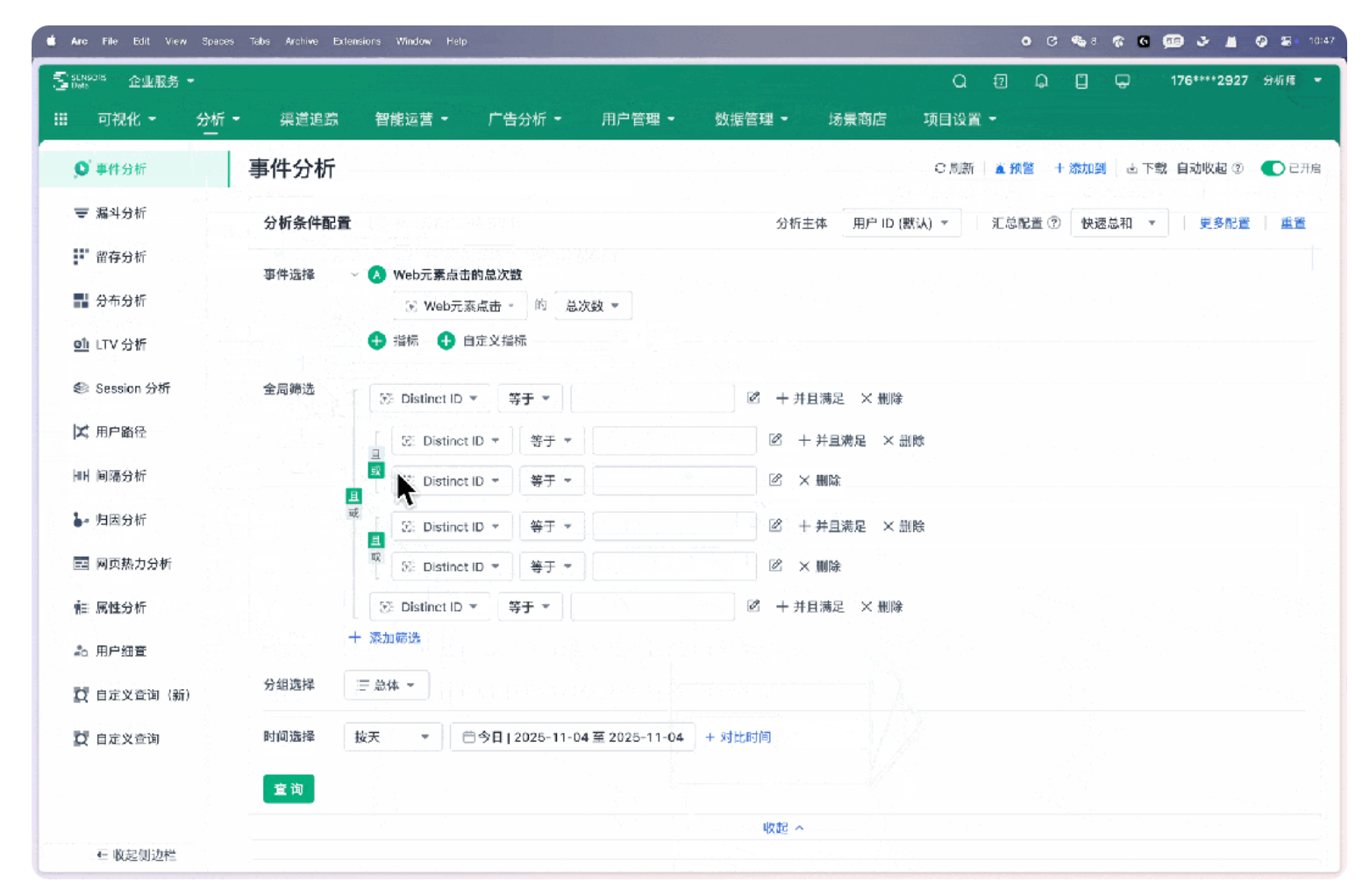 或就是这些条件满足任意一个就能出结果,比如还是电商数据,需要寻找对产品有兴趣的潜在客户,就需要筛选「近 90 天内有过人工咨询记录、近 30 天内访问产品详情页≥6 次、近 180 天内提交过试用申请」,三个条件满足任意一个,这样就能涵盖更为全面。