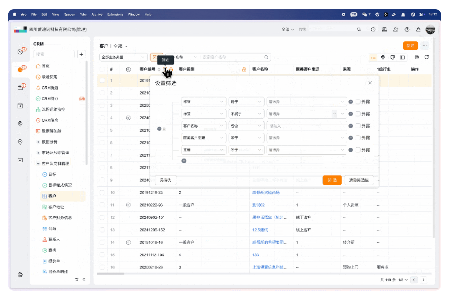 其次用户理解成本也会相对过高,因为很多行业属性相对较为简单的 B 端产品并不会使用这类筛选,对于用户初次使用也会有不小的负担。但表头筛选目前的普及率仍然比较低,使用比较频繁的便是纷享销客。