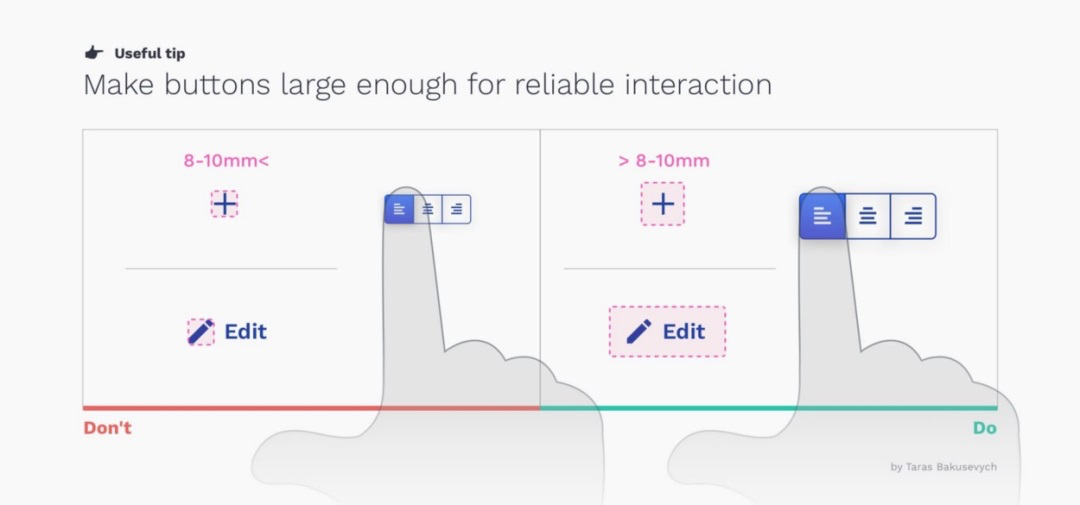 按下一个按钮应是轻松简单的操作。如果用户容易误触相邻元素,会带来糟糕的负面体验。
