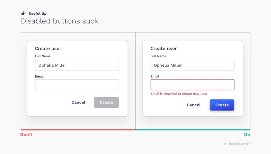 建议:尽量避免使用禁用按钮。更好的做法是始终启用按钮。如果用户遗漏了必填信息,只需在相应空白字段下方给出明确提示,或高亮显示错误项即可。