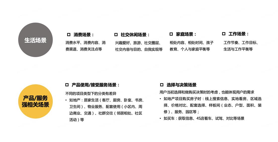 该场景是在地产项目中常见的空间使用场景,在不同的项目类型中我们所关注的场景类型也有所差异,一般可以区分为通用的生活场景和与该产品/服务强相关的场景,其中后者需要重点关注: