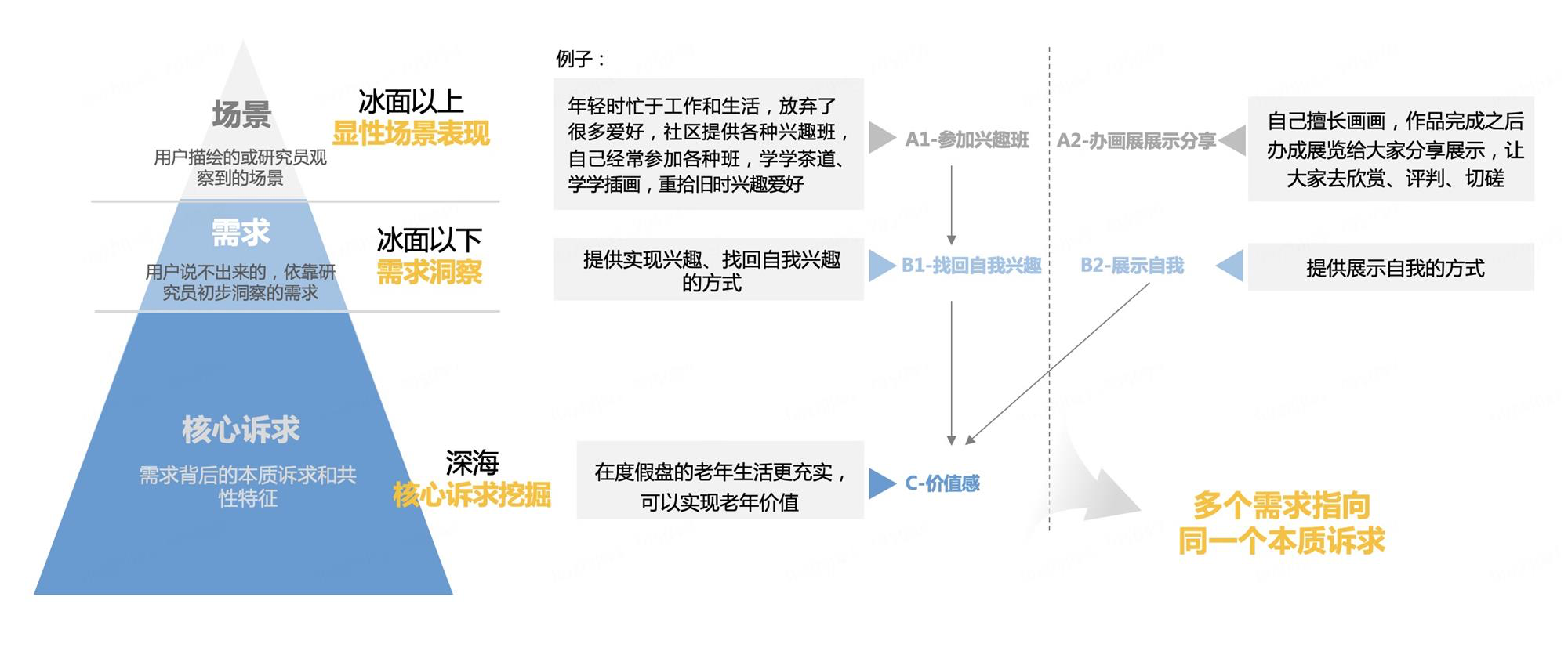 从场景中洞察的需求有时候会偏零散的,无法一步形成系统化建议,如果说场景是冰面以上的东西、需求是冰面以下的东西,那诉求是深海中的、是比需求更深层次的洞察,更有利于总结用户的共性需要,将其作为设计原则、进行系统化设计和建议的提供。