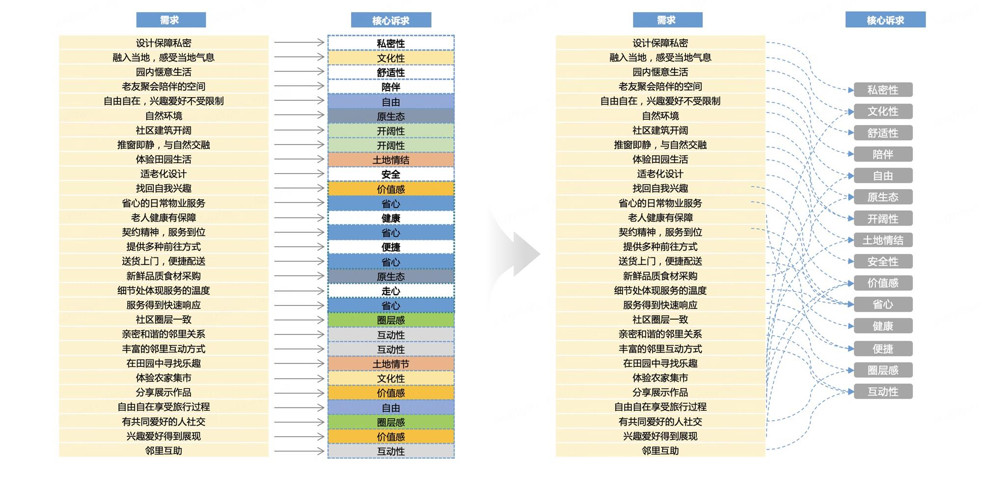 看一些具体的需求-诉求的提炼案例,会发现这些诉求都可以作为产品/服务的设计原则,再应用到不同方面的具体设计中,比如户型的、配套的、物业服务的、社区活动的等等:
