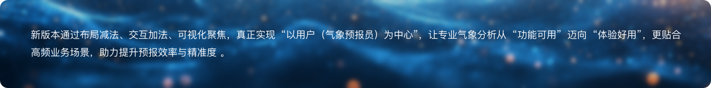 我们分析用户的关键业务场景:在气象预报业务中,精准、高效的网格预报分析是提升气象服务质量的关键。我们在也页面功能架构上进行信息归类区分层级,视觉上按信息层级重新划分模块,保证信息高校传递,交互精确引导,提升用户体验。